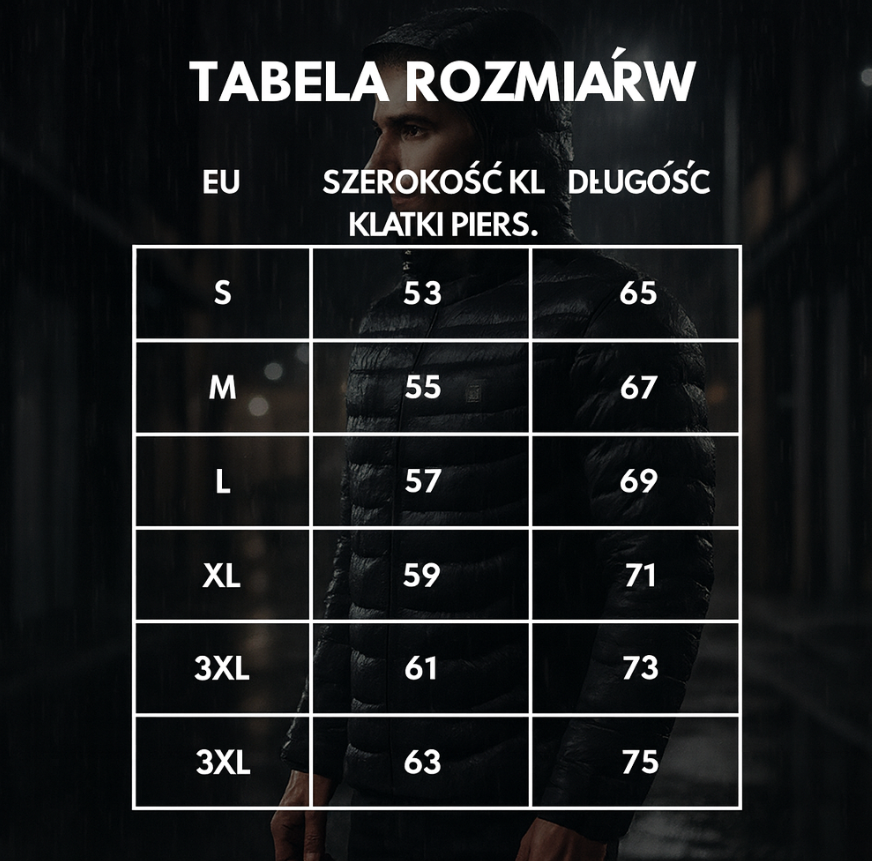 Sprawdź szerokość klatki piersiowej oraz długość kurtki, a następnie wybierz wariant, który będzie najlepiej odpowiadał Twoim potrzebom.